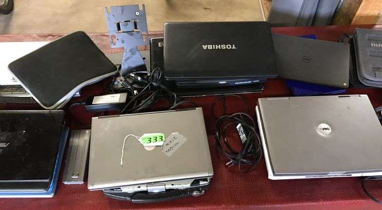 TABLE OF OLDER LAPTOPS, SOME CORDS, MOST ARE IN POOR CONDITION WITH BROKEN SCREENS, NO BATTERIES, ETC, PARTS ONLY PROBABLY