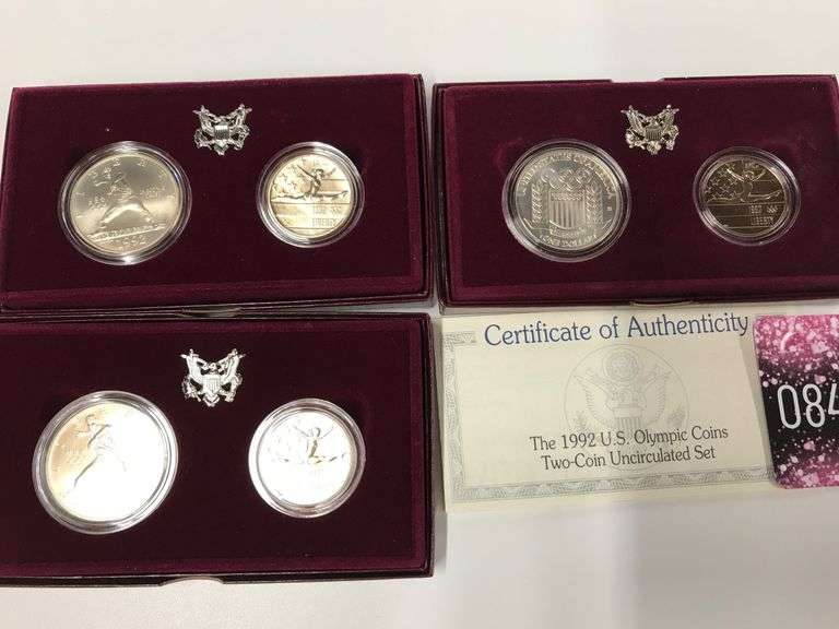 1992 U.S. Olympic Games two-coin silver set issued by the U.S. Mint. Includes two commemorative silver coins: a proof condition silver dollar and a silver half-dollar. Encased in presentation boxes with a Certificate of Authenticity. The set remains in as new condition with original packaging.
