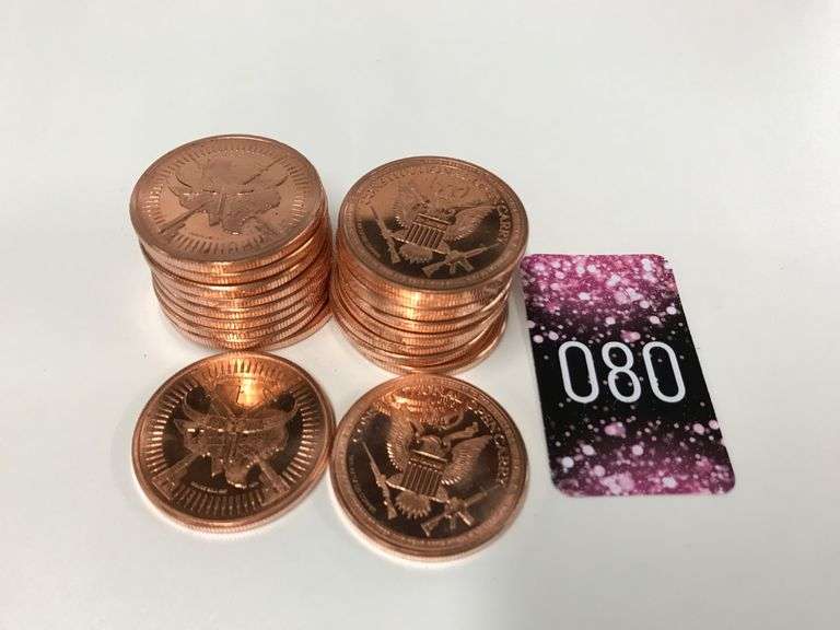 20 one troy ounce copper rounds, each constructed from .999 fine copper. Featuring constitutional-themed designs, including eagles, rifles, and emblems, these rounds are in as new condition with no visible wear.
