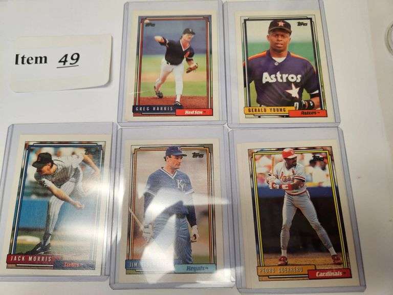 (8) 1992 Topps baseball cards in protective sleeves. Includes cards for players Jack Morris (#235), Jim Eisenreich (#469), Lonnie Smith (#467), Pedro Guerrero (#470), Greg Harris (#468), Jose DeJesus (#471), Gerald Young (#241), and Scott Bankhead (#155). Cards are in visually good condition, showcasing players' achievements and statistics from their careers.