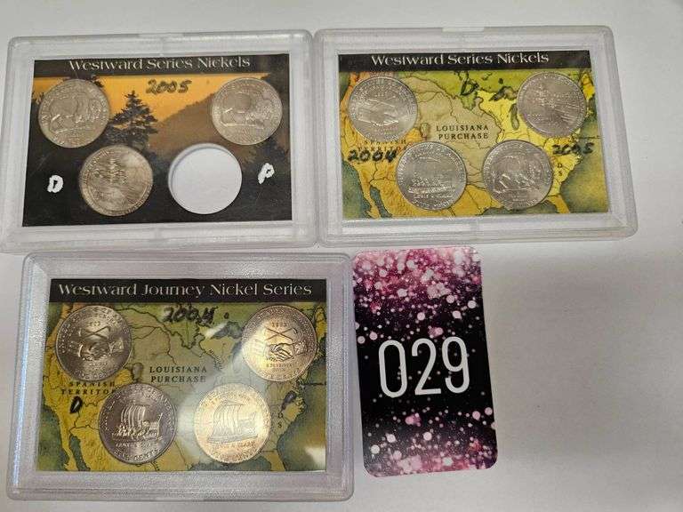 Three sets of Westward Journey Nickel Series collections. Each case contains multiple Jefferson nickels from the 2004–2005 series, featuring design themes such as the Louisiana Purchase and the American West. The coins are encased in protective plastic holders, with illustrated backdrops highlighting historical maps and visuals. Condition appears consistent with circulated or uncirculated sets.