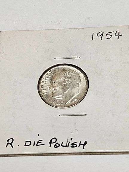 1954 Roosevelt Dime made of 90% silver and 10% copper. The coin exhibits a die polish error, as indicated on the holder, with year '1954' clearly marked on the front.