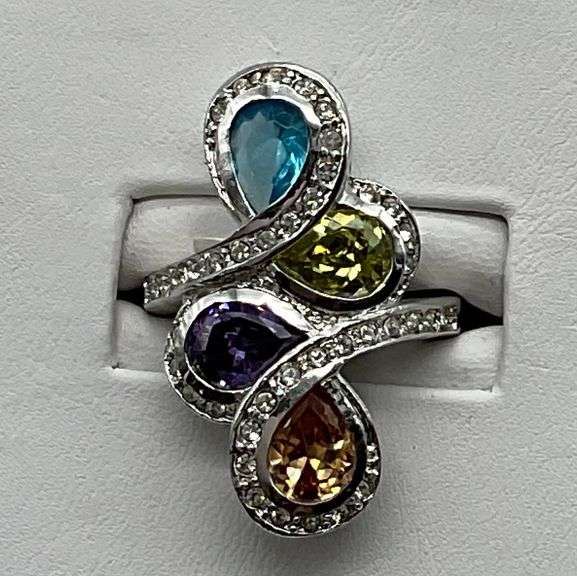 | Sterling Silver multi color stone ring. Features pear shaped stones in blue , green, purple & peach. Size 8 |